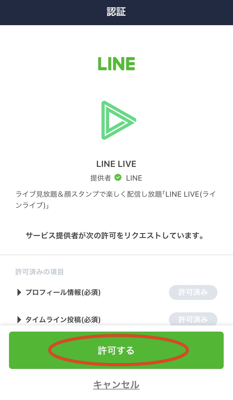 LINEアカウントでログインした場合、利用規約に同意すると認証画面になりますので、「許可」その次の画面で「確認」すればOKです!